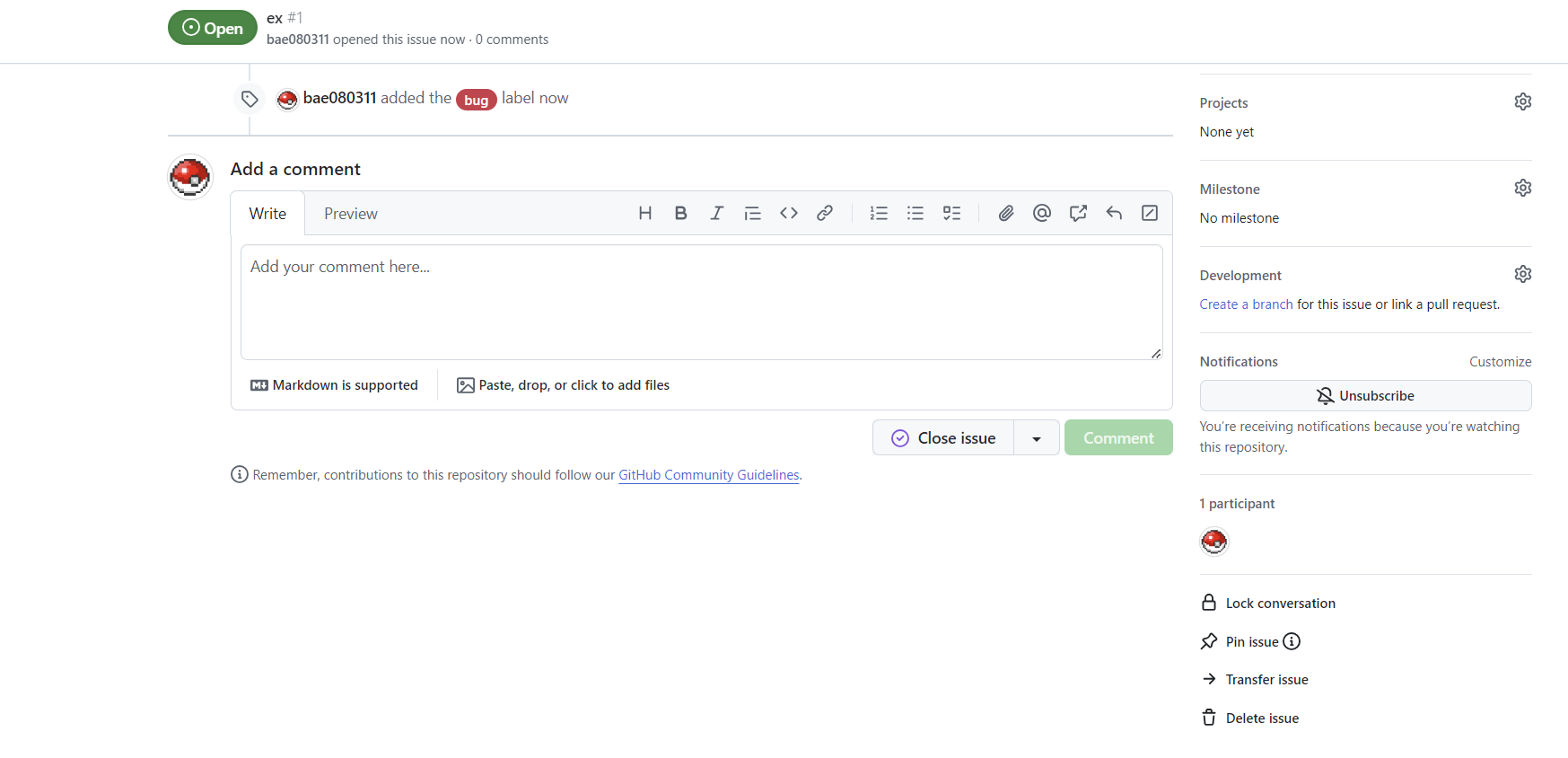 이런 설정들을 하고 제목과 설명을 적고 저기 보이는 초록색 Submit new issue 버튼을 누르면 이슈가 생성됩니다